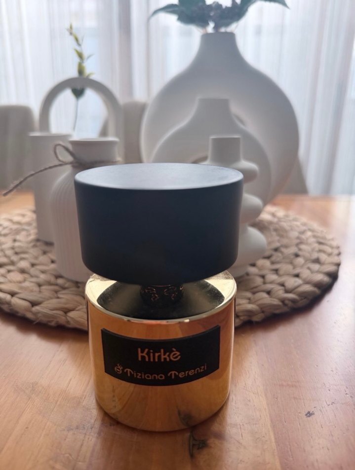 Kirke erkek parfümü, parlak altın şişede ve siyah kapaklıdır. Sıcak ve bohem bir tarz sunar. Etiketinde 'Kirke' yazmaktadır.