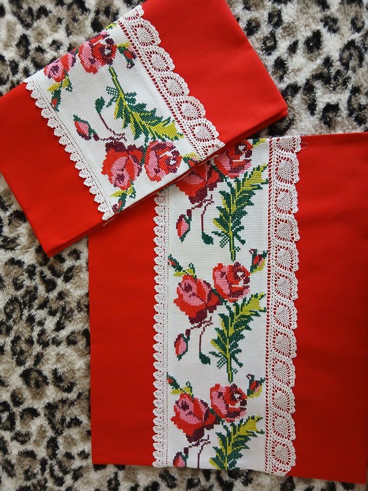 Kenarları dantel detaylı, renkli nakışlı çiçek desenine sahip kırmızı yastık kılıfları, dekoratif bir görünüm sunar. elişi kanaviçe kullanılmıştır
