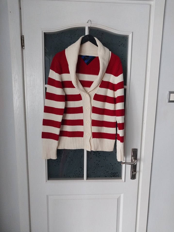 Fitted kesim, uzun kollu örgü kadın hırka. Kırmızı beyaz çizgili desene ve notched lapel yaka detayına sahip, günlük kullanıma uygun. xl yazyör fakat kalıb dar ondan 38 yazdım ürün as kulanmış temiz ve kusursuz.