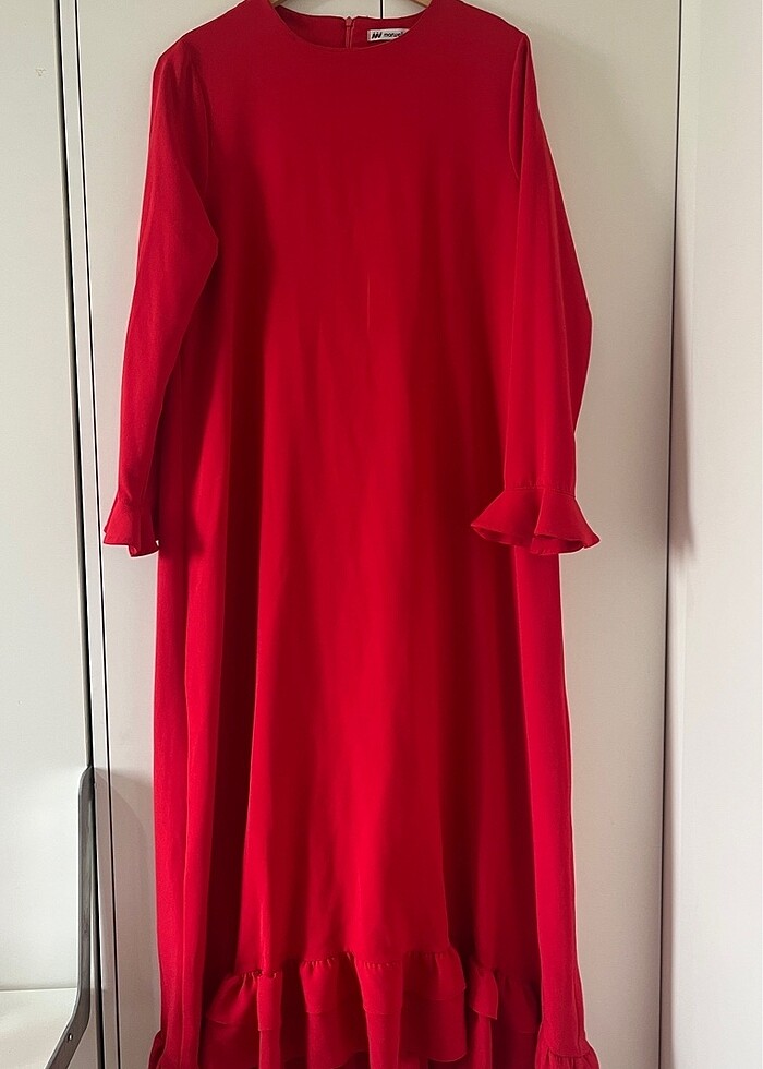 Ürün 1 kere giyilmiştir Krep kumaştır 42-44 beden uyumludur belden A kesim inmektedir El ve ayak bileklerinle volan detayı mevcuttur özel günlerinize en iyi eşlikçi olabilir :)
