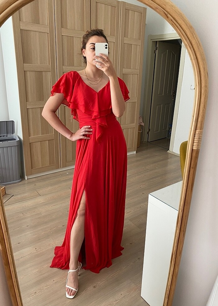 Göğüs detayı daha açıktı yaptırdım. Yırtmaçlı kırmızı abiye