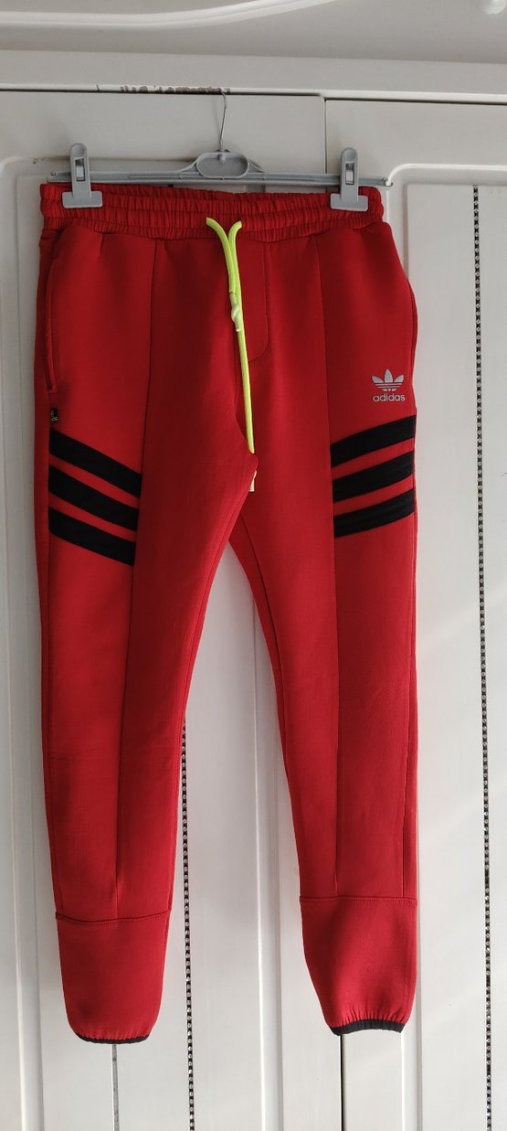Kırmızı Adidas eşofman altı, dar kesim, fermuarlı cepler ve siyah şeritlere sahip. Sıcak tutan kumaştan, sportif sokak stiline uygun. orjinal