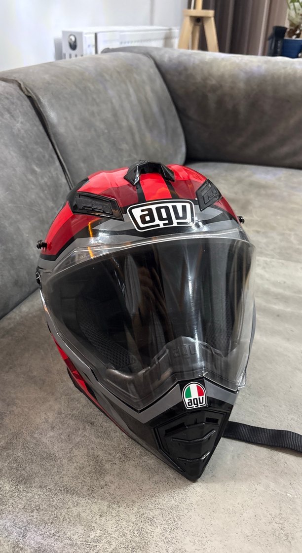 Cesur kırmızı AGV motor kaskı, tokalı tasarımı ve koyu desenli yüzeyi ile dikkat çeker. Cam vizöre ve minimalist stile sahiptir. ️