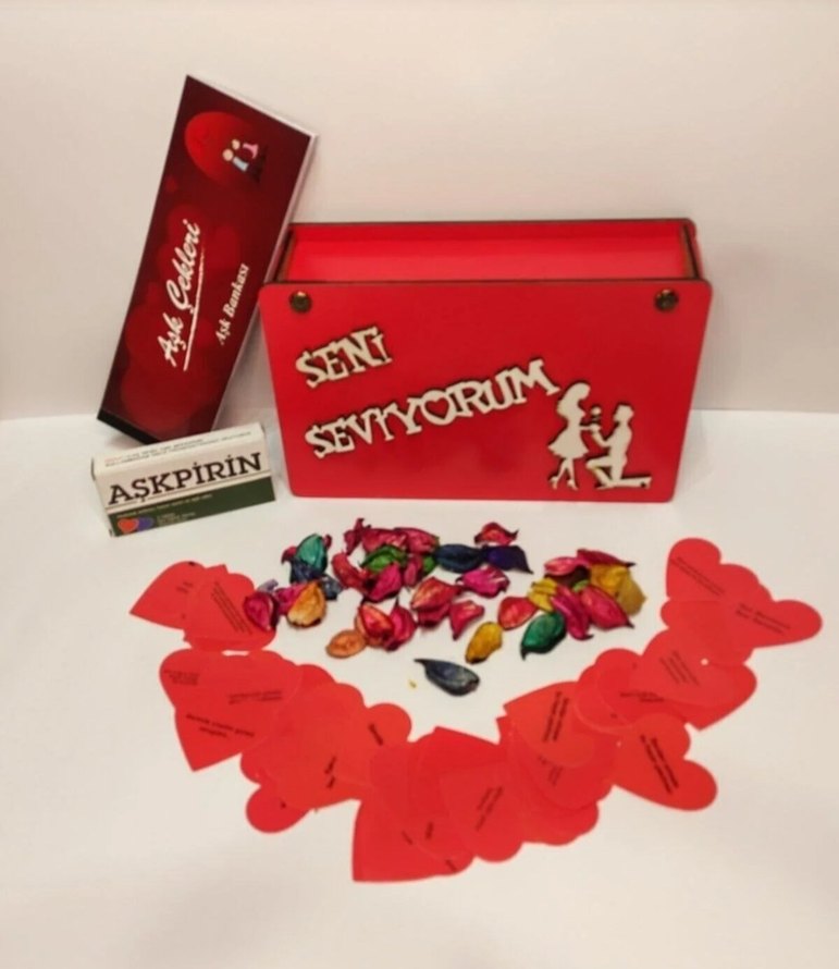 Kırmızı ahşap Aşk Kutusu ve Kart Oyunu