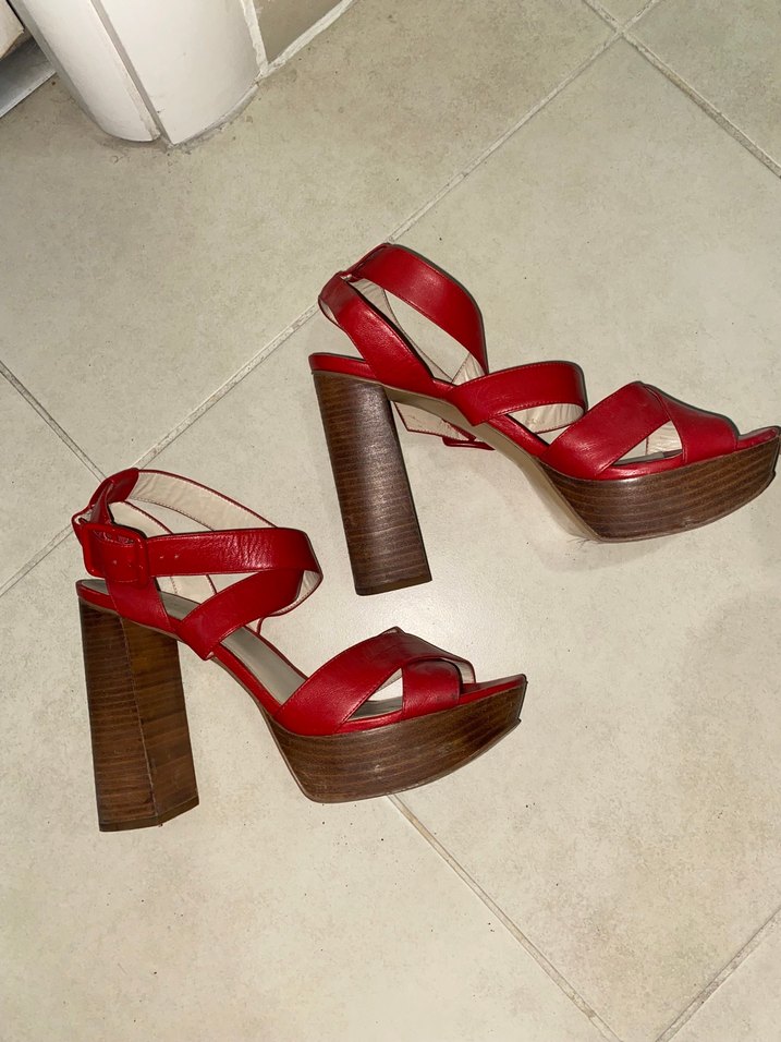 Kırmızı parlak deri kayışlı, tokalı, ahşap platform topuklu kadın ayakkabısı. Minimalist, çağdaş tarzda, romantik buluşmalar için uygun. Topuk boyu 15 cm