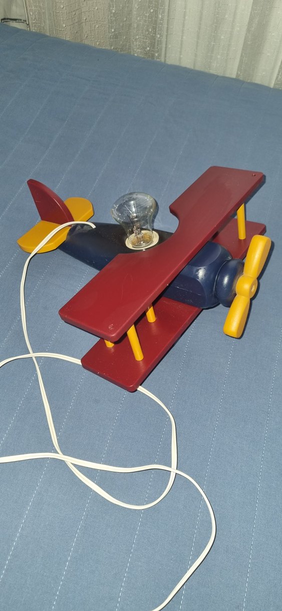 Kırmızı gövde ve sarı pervane ile renkli ahşap uçak lamba, üstünde ışık ampulü bulunur. ✈️uçak lamba temiz ürün çalışıyor..bir tekerinde kapak eksik #uçak #lamba #aksesuar