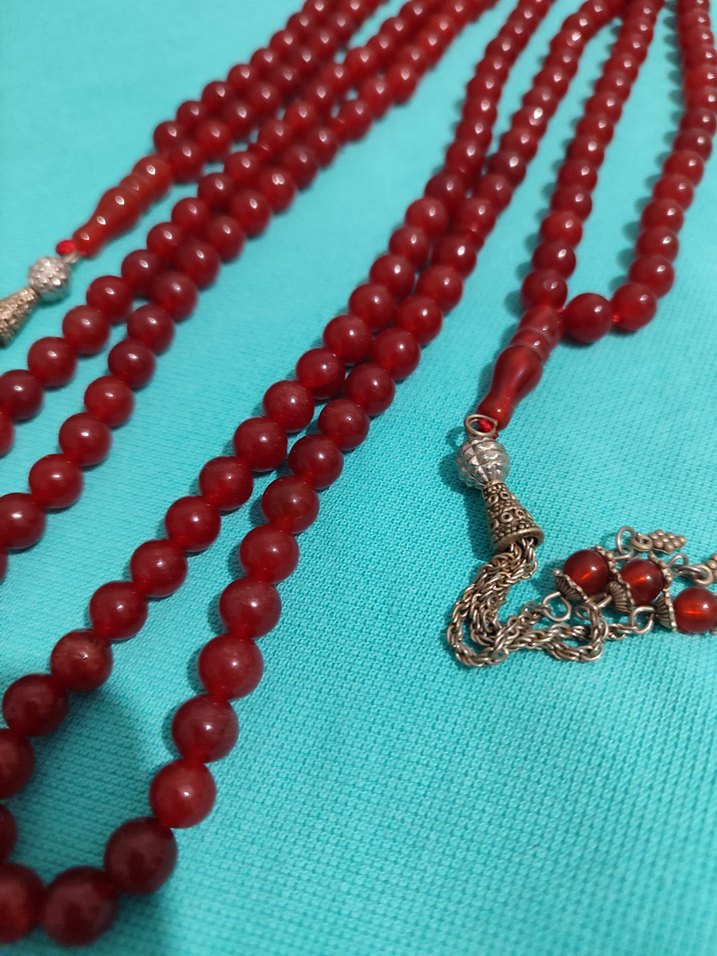 Kırmızı renkli, klasik tarzda namaz tesbihi.Pürüzsüz yuvarlak boncuklar, dekoratif gümüş detaylarla bir arada.