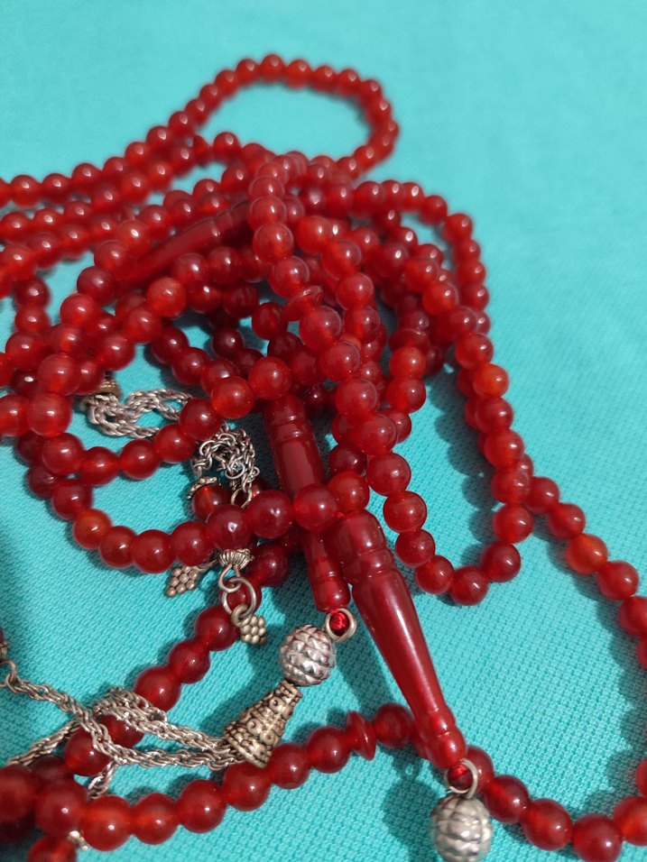 Canlı kırmızı boncuklardan oluşan akik namaz tesbihi