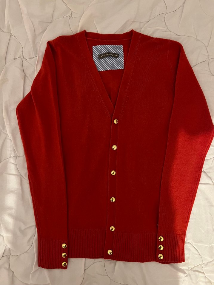 Düğmeli önü, uzun kollu, regular fit hırka. Kırmızı renkte, örme kumaştan, desensiz şık.Kalıbı xs için uygun.