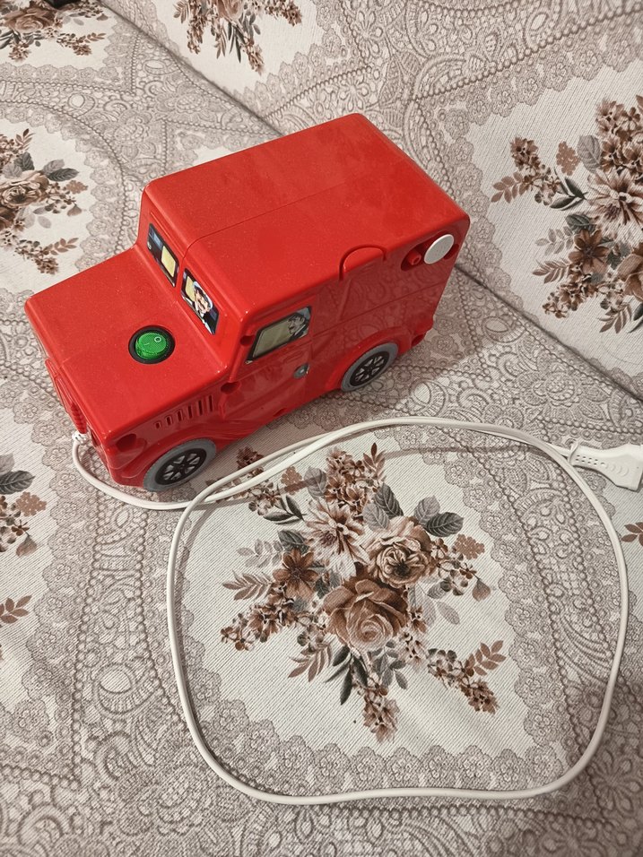 Kırmızı renkli oyuncak araba, tekerlekleri ve üstünde bir düğmesi bulunur. Beyaz bir kablo ile gelir.