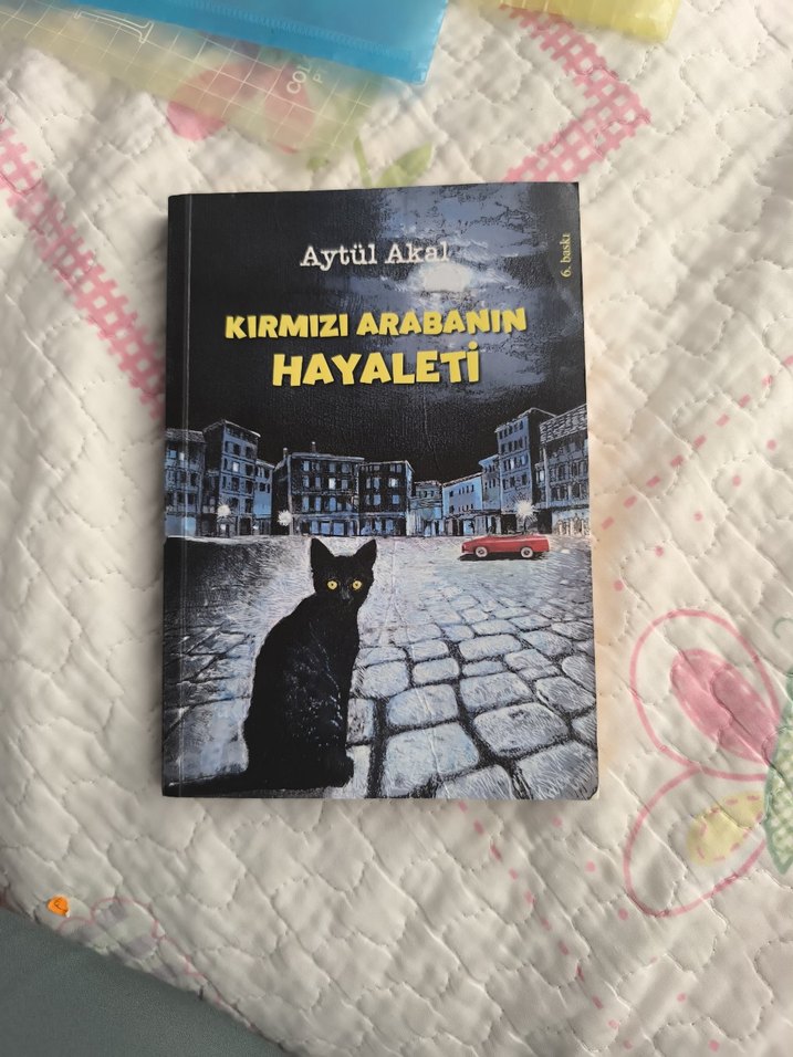 Aytül Akal'ın Kırmızı Arabanın Hayaleti adlı romanı, kapakta kırmızı araba ve siyah kedi ile gizemli bir hikaye sunuyor.