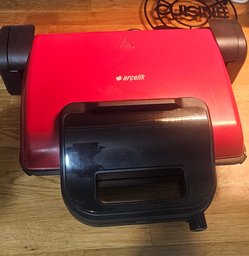 Kırmızı renkli Arçelik tost makinesi, koyu renk kulpu ve kompakt tasarımıyla kolay kullanım sağlar. Tost hazırlamak için uygundur.