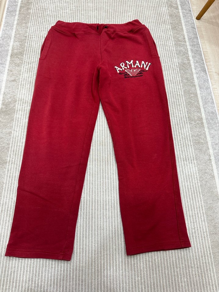 Kırmızı, bol kesim Armani eşofman altı, fermuarlı cepler ve baskılı logo detayına sahip, yumuşak ve sıcak kumaştan üretilmiştir. L/XL bedenler için uygundur #erkek #eşortman #giyim boy 101 cm bel 44 cm