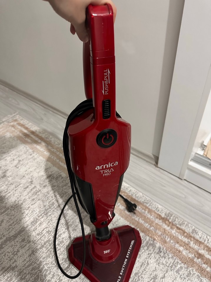 Koyu kırmızı renkte Arnica Tria Pro elektrikli süpürge, 360° dönebilen başlığı ve kullanımı kolay push-pull kolu ile etkili temizlik sağlar. Güncel fiyatı 2750