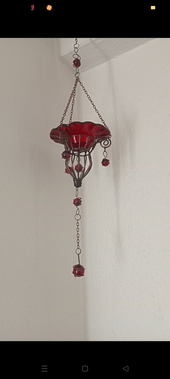 Koyu kırmızı cam tabağa sahip, metal zincirler ve kırmızı boncuk detayları bulunan asılı mumluk. Her ortama şık bir dokunuş katar. ️