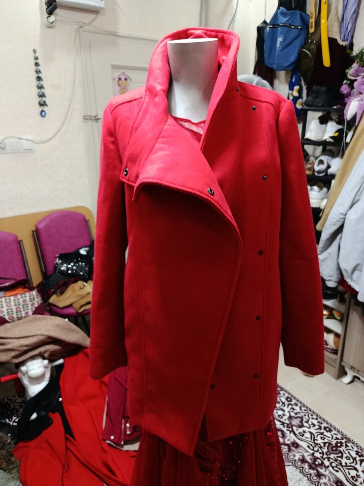 Kırmızı renkte, asimetrik kesime sahip, çıtçıtlı kapamalı ve yüksek yakalı kadın kabanı.