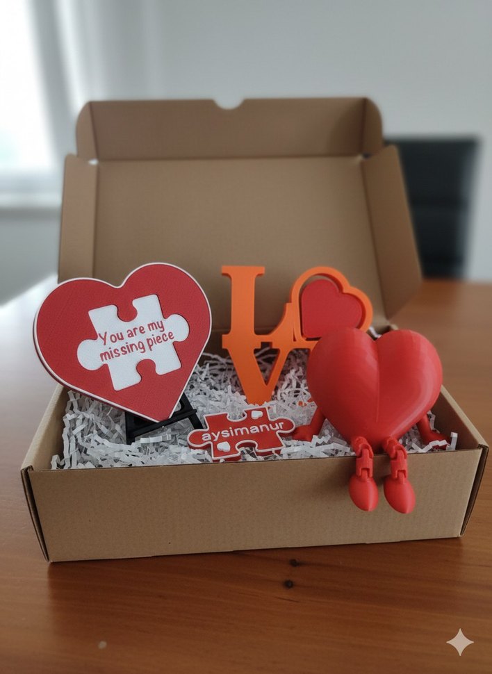 Kırmızı kalp şeklinde 'You are my missing piece' yazılı puzzle parçası, turuncu 'LOVE' yazısı ve bacaklı kırmızı kalp figürü içeren set. ❤️