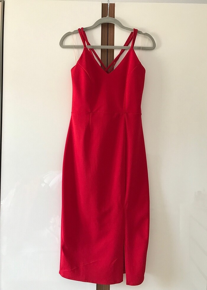 Kırmızı askılı arkazı çapraz yırtmaçlı elbise