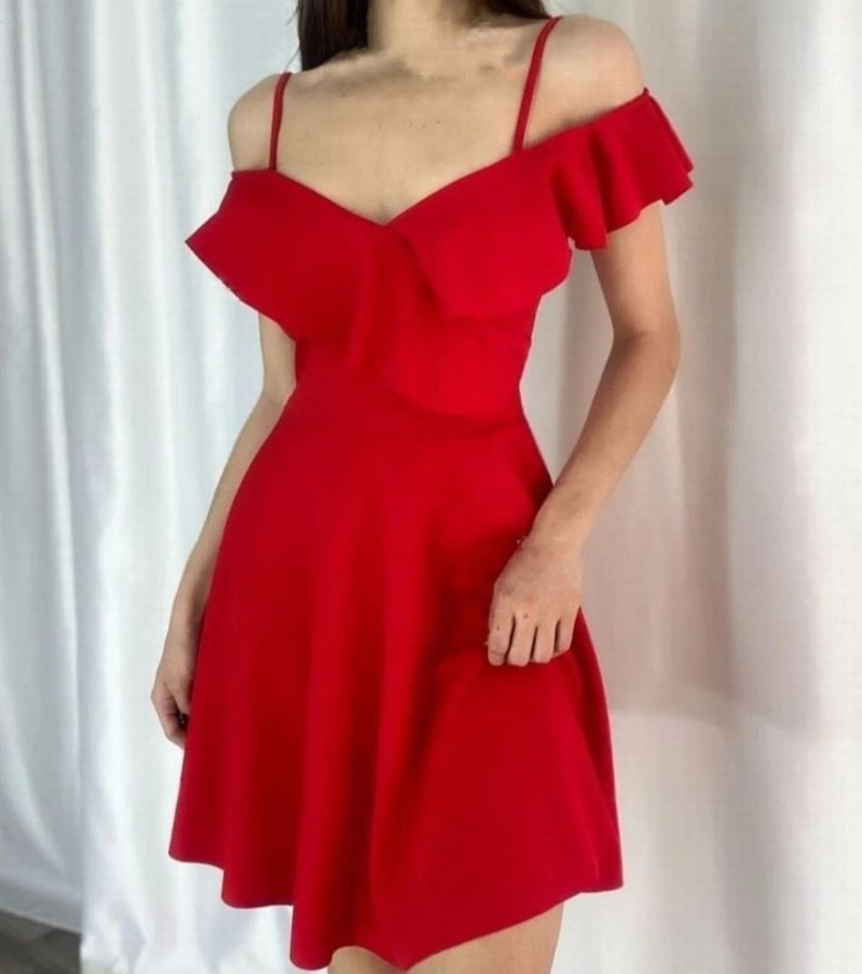 kırmızı, askılı fırfır detaylı S beden sadece 1 kez giyilmiş elbise