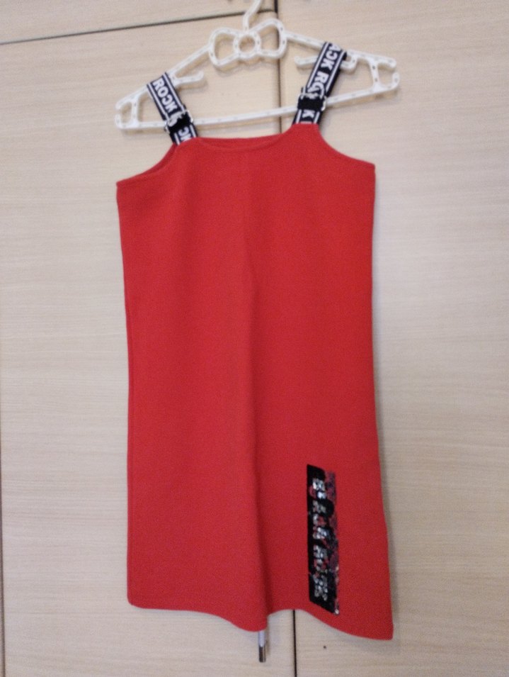 Kırmızı askılı, baskılı siyah beyaz bantlara sahip, Velcro detaylıdır. Trendy günlük tarz için uygun. omuzdan ayarlanabilir askıları mevcut.omuzdan etek ucuna 80 cm