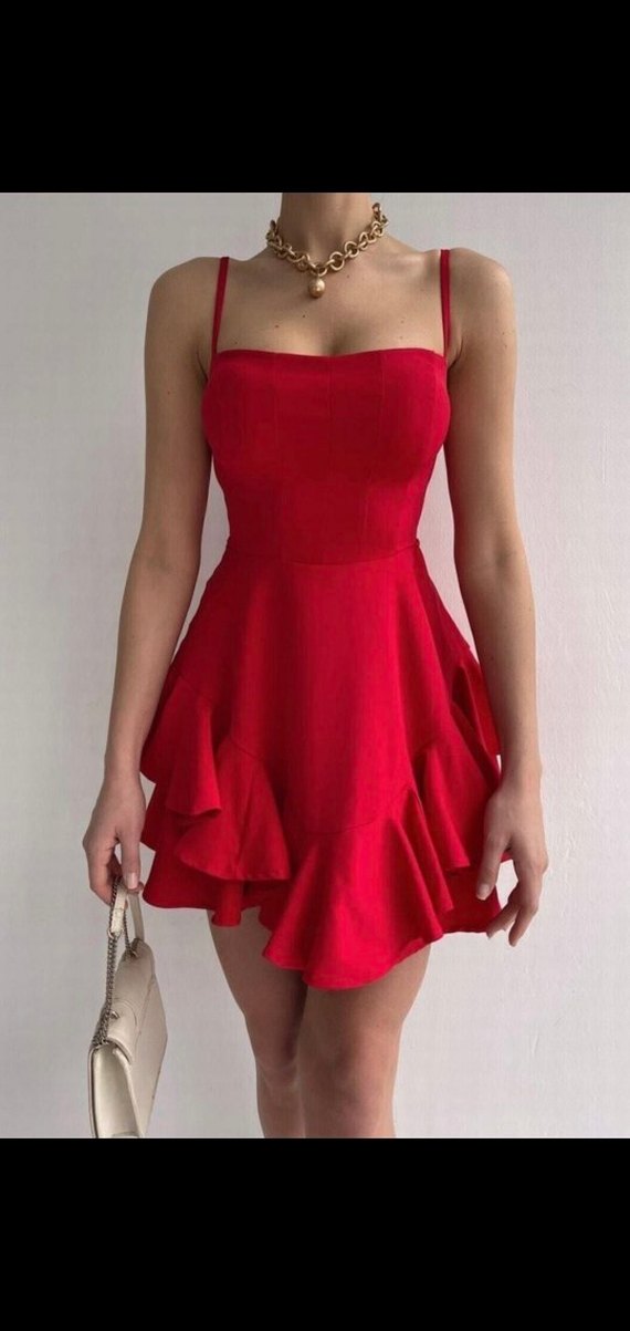 Parlak kırmızı, askılı ve mini boy, volan detaylı bu dar kesim elbise cesur romantik akşamlar için ideal.