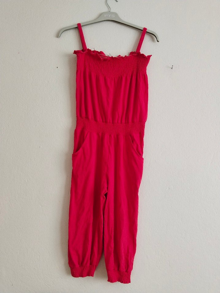kırmızı renkte askılı beli büzgülü tulum