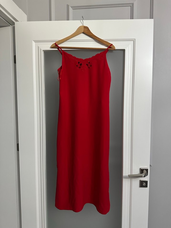 Kırmızı uzun elbise, askılı ve drapeli detaylara sahip. İpek gibi kumaştan üretilmiş, straplez yakasıyla romantik akşamlar için ideal, klasik zarif ve minimal stil sunar.