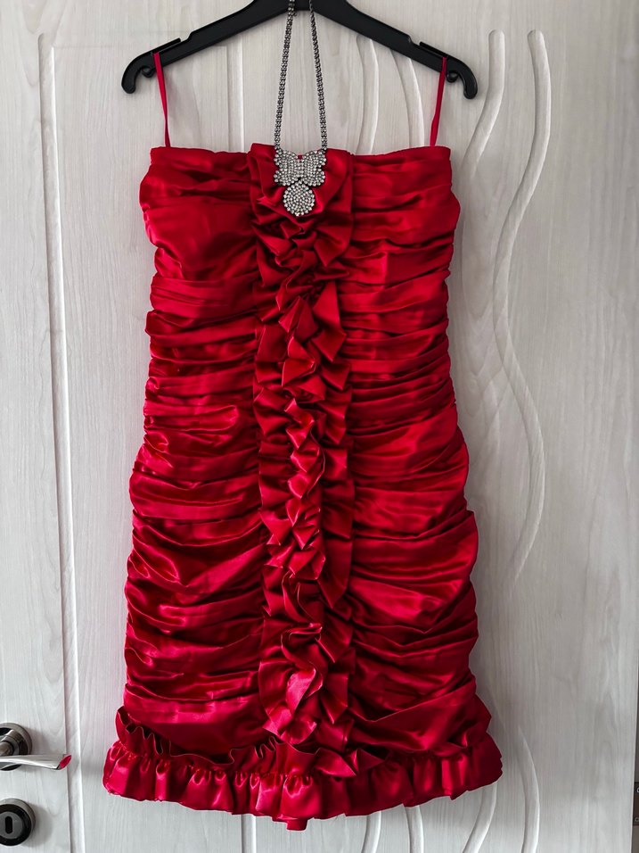 Parlak kırmızı saten, gümüş kolyeli, abiye elbise Gümüş kolye kısmı dolapta biraz karardı Ve biraz ipi çekilmiş ama dışarıdan dikkat çekmiyor bence. Yo kısmın fotoğrafını yakından çekip sona koydum