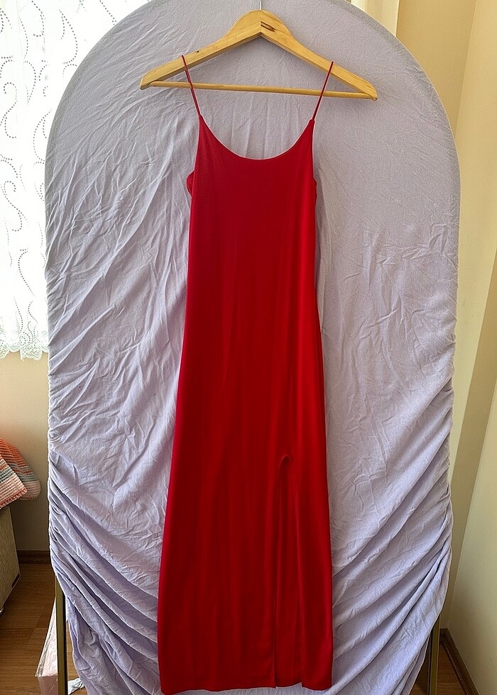 Kırmızı renk. 36-Small beden. Sadece bir defa giyildi. Yırtmaç detaylı, şık bir elbise.