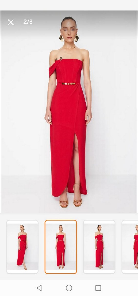 Kırmızı, askısız uzun elbise, kemerli bel ve yırtmaç detayına sahip, , romantik akşamlar için uygun.