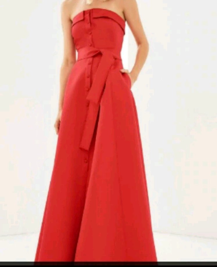 Parlak kırmızı askısız uzun elbise, kemerli ve sentetik saten kumaştan. Düzenli kesim ve kolsuz yapısıyla düğünler için modern klasik tarzda.