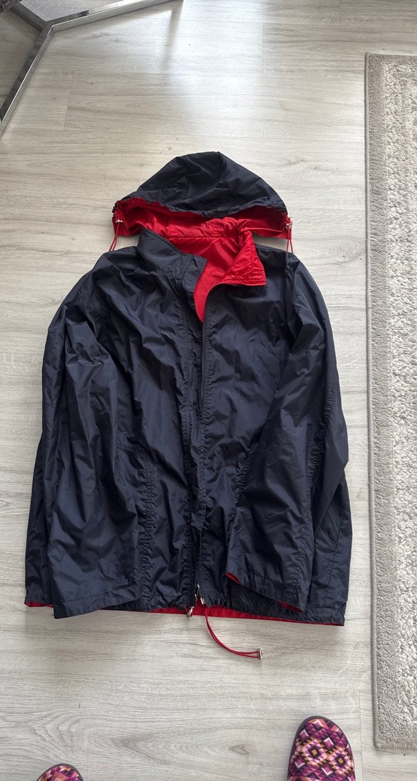 Yüksek yakalı, fermuarlı, yumuşak kürk astarlı erkek yağmurluk. Gevşek kesim, uzun kollu ve kapüşonlu. Siyah dış, kırmızı iç tasarımlı, dış mekan için uygun. ️1/2 kullanıldı çift taraflı kullanılabilir