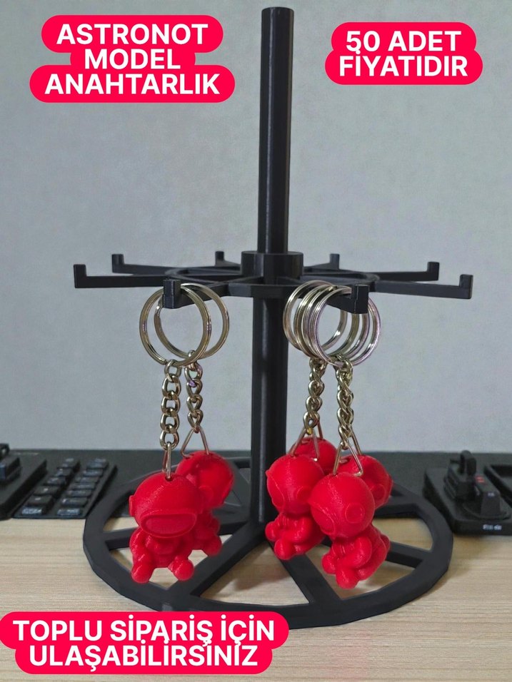 Renkli kırmızı astronot figürlü anahtarlıklar.50 adet toplu sipariş için uygundur. 3d yazıcı ile yapılmıştır stand ile birlikte gönderilecektir istenilen renkte yapılabilir