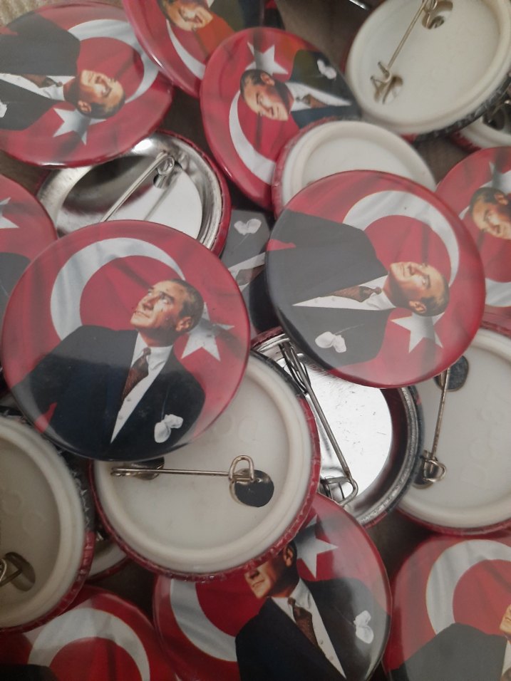 Klasik ay-yıldız arka planlı parlak kırmızı vintage Atatürk rozetleri. Her rozetin arkasında takmak için iğne bulunmaktadır.
