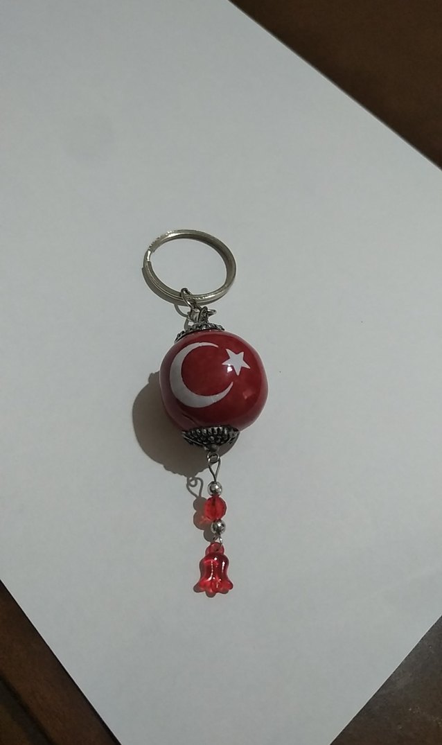 Kırmızı boncuk üzerinde beyaz ay yıldızı bulunan, küçük kırmızı boncuklar ve bir figürle süslenmiş erkek anahtarlığı. Sade ve geleneksel tasarım.