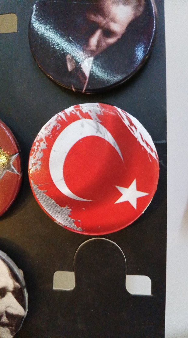 Koyu kırmızı renkte, ay ve yıldız figürlü erkek rozeti. Mütevazı ve grunge punk tarzını yansıtır. ✨