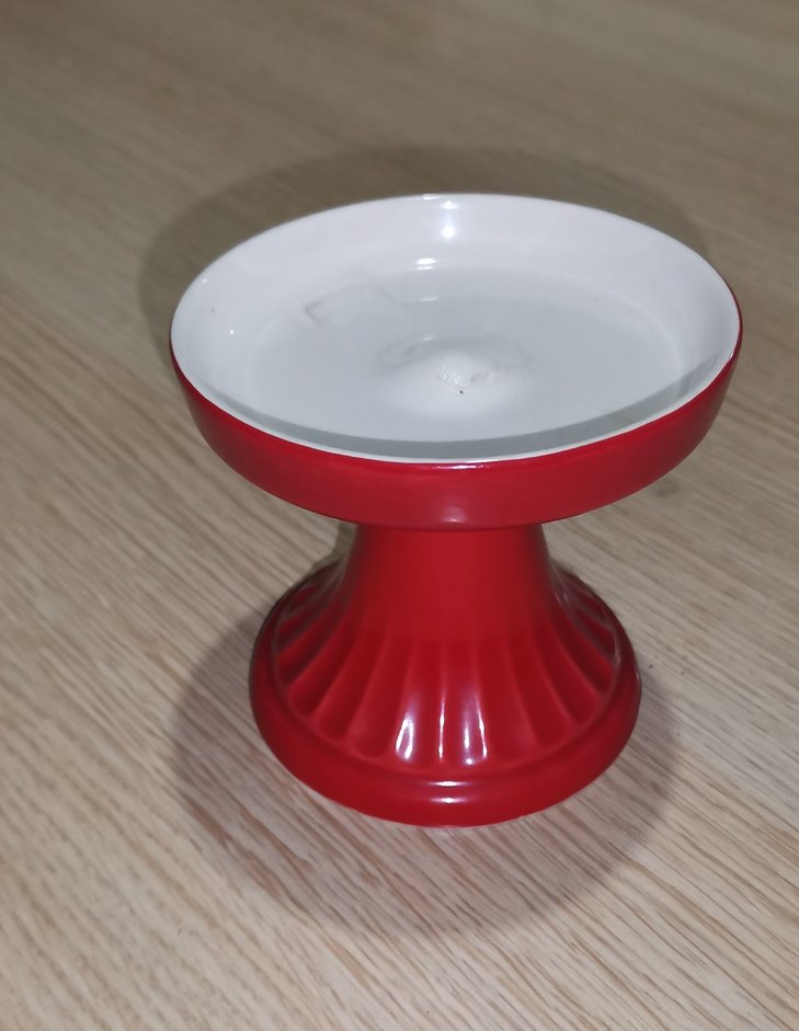 Kırmızı ayaklı tabak, sade ve desensiz tasarıma sahip. İç kısmı beyaz, renkli bir kontrast oluşturuyor. ️