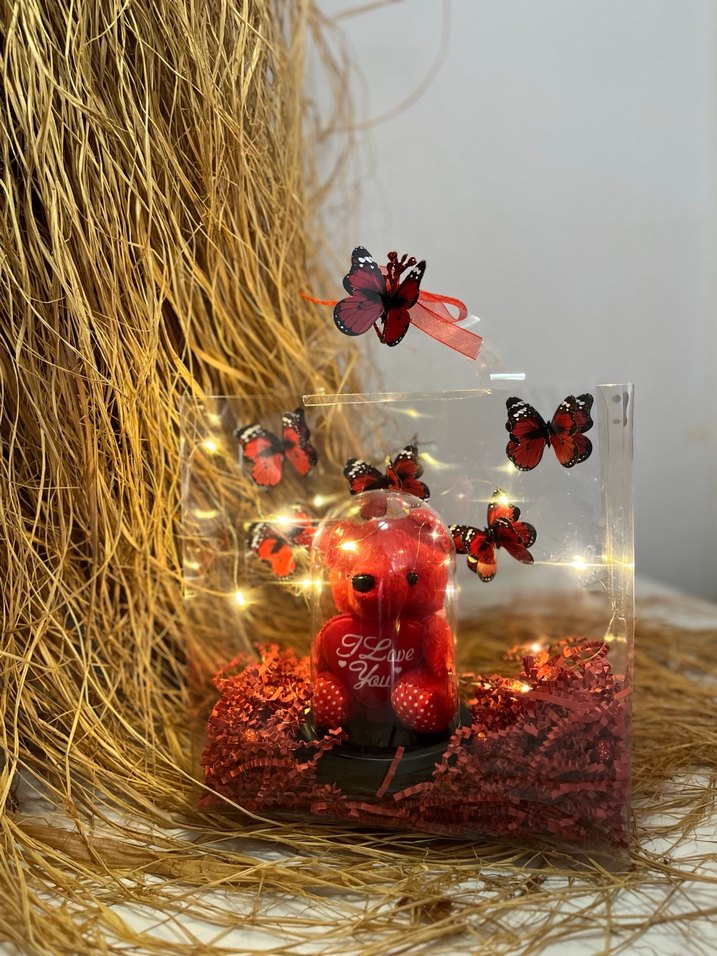 Şeffaf kutu içinde kırmızı ayıcık ve etrafında kırmızı kelebekler bulunan, sıcak ışıklarla süslenmiş dekoratif ürün.