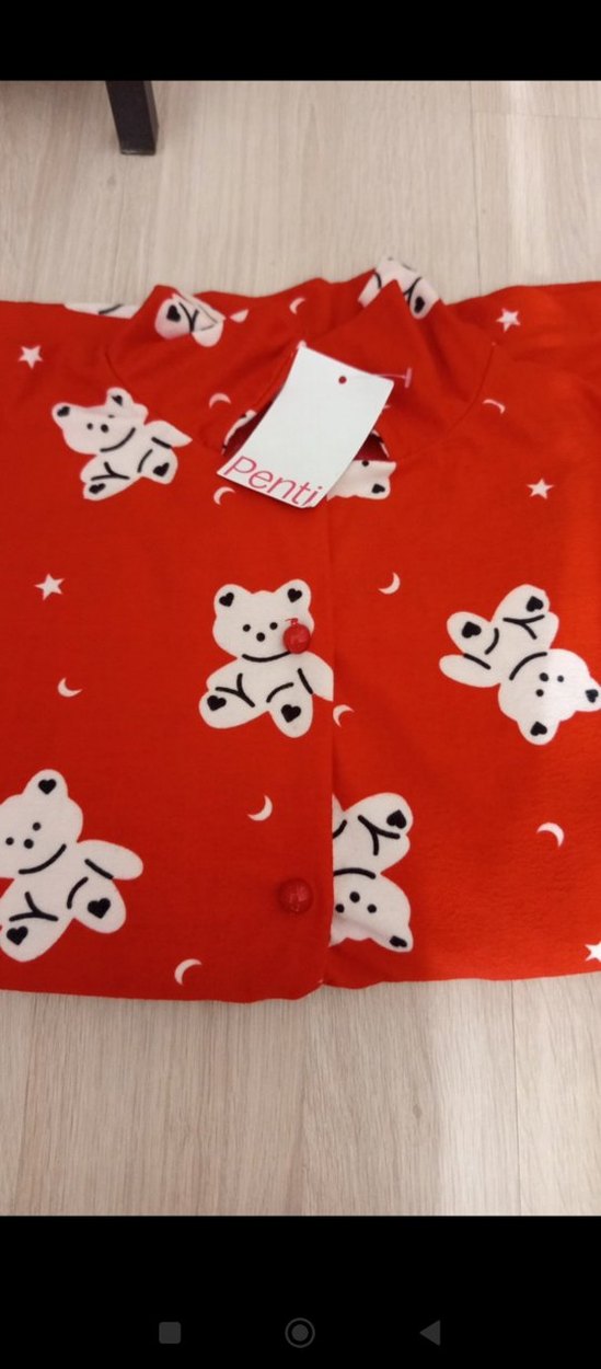 Uzun kollu, kırmızı renkli ve ayıcık desenli kadın pijama takımı. Normal boy elastik bel bulunur.