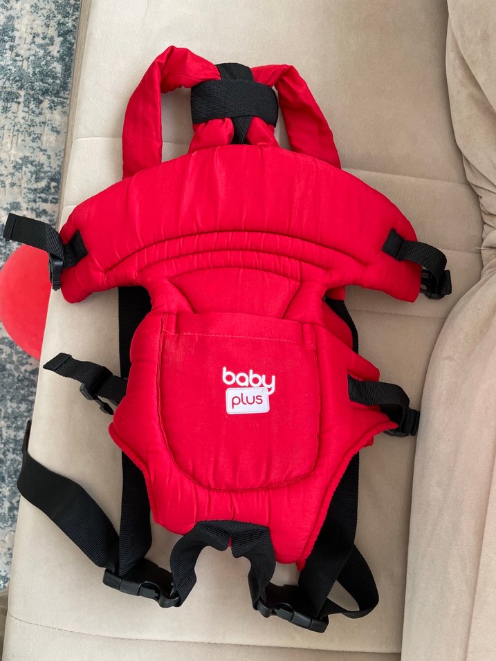 Ayarlanabilir askılı, yumuşak destekli kırmızı Baby Plus bebek taşıyıcı. Rahat ve güvenli taşıma sağlar. Az kullanıldı