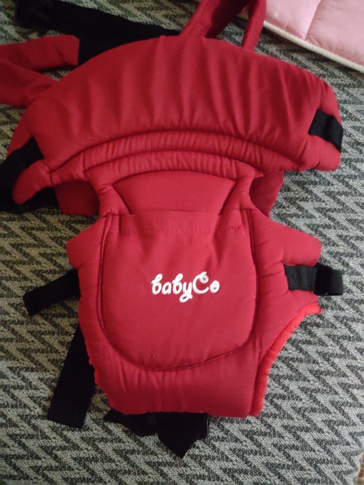 Kırmızı BabyCo bebek kanguru, yumuşak dolgulu askılar ve ayarlanabilir siyah tokalarla güvenli taşıma sağlar. Hem bebek hem ebeveyn için konforludur.