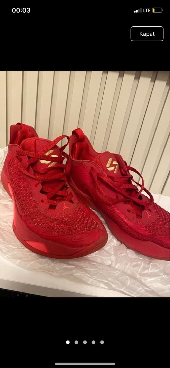 Kırmızı bağcıklı basketbol ayakkabısı, kauçuk tabanlı, sokak stili ve spor için uygun. Renkli ve avant-garde tarzı tercih edenler için ideal. 45 numara orjianl nıke denemeden kaynaklı defarmasyonlar oluşmuş az kullanılmış