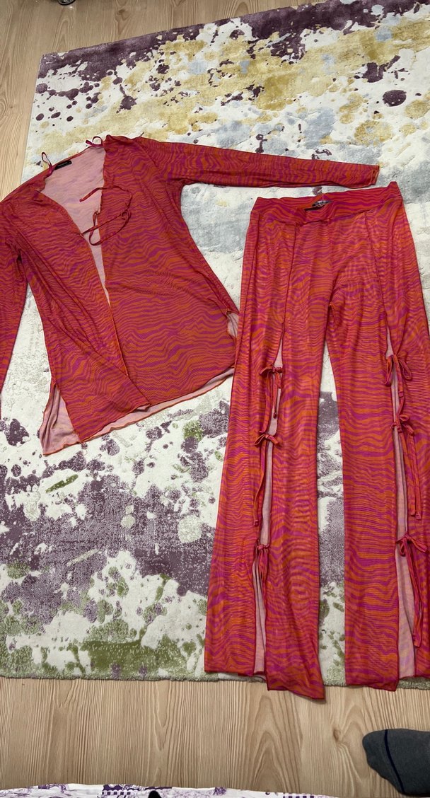 Koyu kırmızı tonlarında bağcıklı detaylı, uzun kollu ve bol kesim kadın plaj takımı. Alt pantolon yanlarında fiyonklarla hareketlendirilmiş.