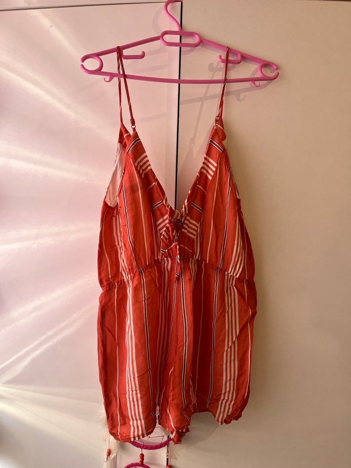 Kırmızı bohem tulum, drapeli, v yaka ve ince askılıdır. Gevşek kesim, parlak çizgili batik desene sahip, yumuşak sentetik kumaştan üretilmiştir. Günlük kullanım için uygundur.