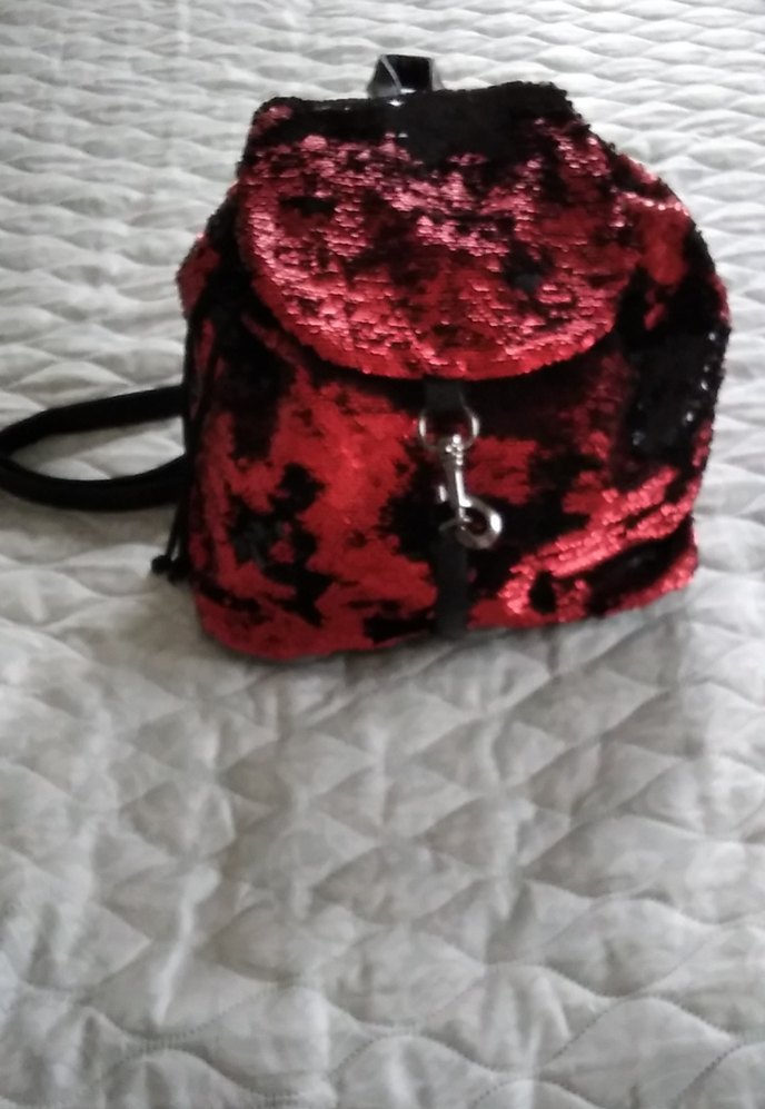 Koyu kırmızı ve siyah pullu, bağcıklı kapaklı kadın sırt çantası. Sentetik kumaştan, grunge punk ve bohem tarzlara uygun.