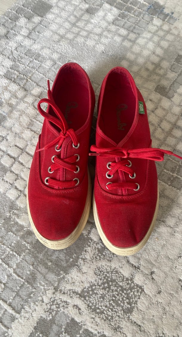 Kırmızı, düğmeli bağcıklı, lastik tabanlı kadın spor ayakkabısı. Canlı renkli, desen içermeyen günlük kullanıma uygun model.