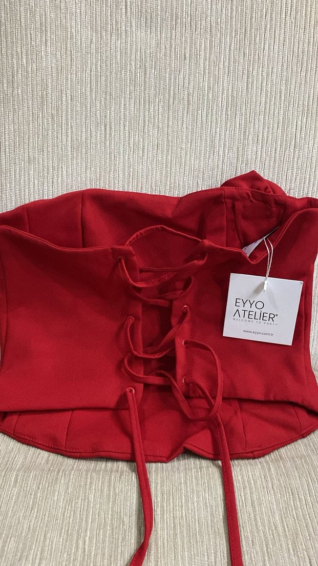 Kırmızı, bağcıklı, ince askılı ve fırfırlı mini bustiyer. Sentetik kumaştan, baskılı ve dar kesim. Marka: EYYO ATELIER. ❤️