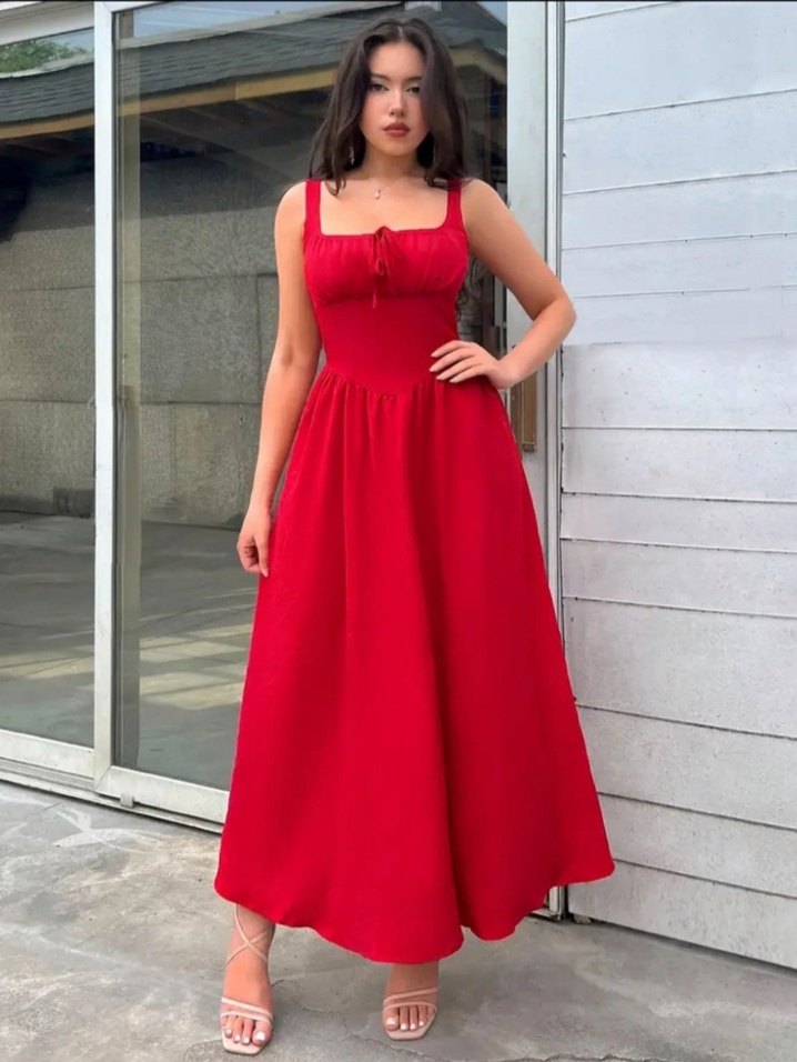 Kırmızı Bağcıklı Poplin Elbise