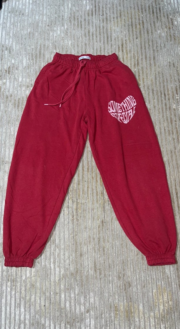 Kırmızı, bağcıklı ve lastikli bilek detaylı, rahat kesim kadın eşofmanı. kalp grafik detaylıdır. ❤️