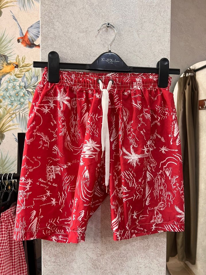 Renkli kırmızı tie-dye desene sahip, bağcıklı ve elastik bel bantlı, bol kesim erkek şort. Plaj ve sokak stili için uygun.